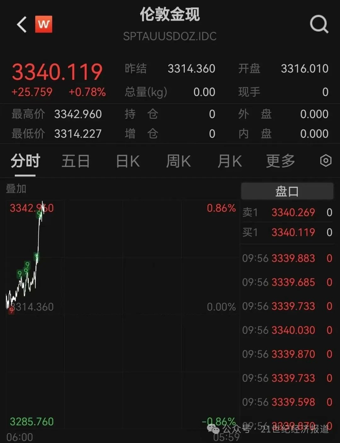 5月22日,现货黄金持续拉升,上破3340美元/盎司,续创5月9日来新高,截至9:57,日内涨0.78%。