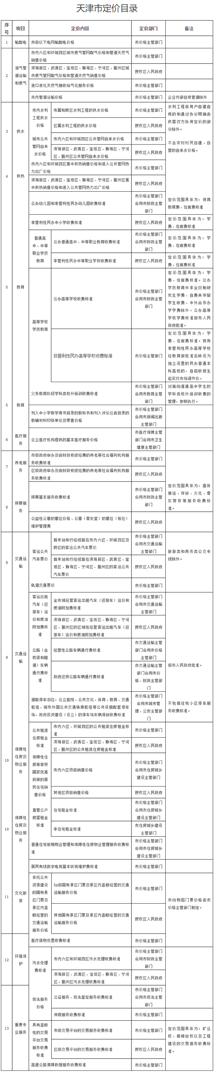 定价目录是规范政府定价权限和范围的清单,此次公布的《目录》定价范围主要限定在重要公用事业、公益性服务和网络型自然垄断环节三大领域,包括输配电、油气管道运输和燃气、供水、供热、教育、医疗服务、养老服务、殡葬服务、交通运输、保障性住房及物业服务、文化旅游、环境保护、重要专业服务等13类。列入《目录》的项目,实行政府定价或政府指导价管理。