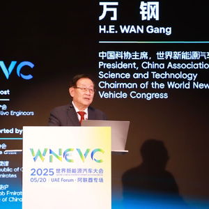 中国科学技术协会主席、世界新能源汽车大会主席万钢在2025世界新能源汽车大会(阿联酋专场)上作主旨演讲。(经济日报记者 李学华摄)