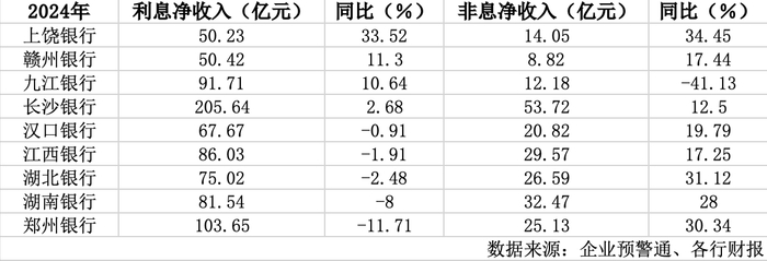 从利息结构来看,9家样本城商行均出现了非息收入占比有所提升的情况,并且在息差承压、银行利息净收入整体下降的环境下,长沙银行、上饶银行和赣州银行实现了利息与非息净收入的同比双增,显示出多元化业务布局初见成效。其中,2024年长沙银行利息净收入为205.64亿元,同比增加2.68%;非息净收入为53.72亿元,同比增加12.5%。上饶银行2024年利息净收入为50.23亿元,同比增加33.52%;非息净收入为14.05亿元,同比增加34.45%。赣州银行2024年利息净收入为50.42亿元,同比增加11.3%;非息净收入为8.82亿元,同比增加17.44%。