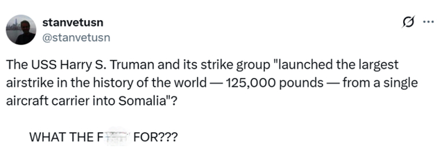 还有网友发帖称,“美国海军‘哈里·杜鲁门’号航母及其战斗群‘从一艘航母上向索马里发动了世界历史上最大的一次空袭——12.5 万磅’?这究竟是搞什么鬼???” ↓