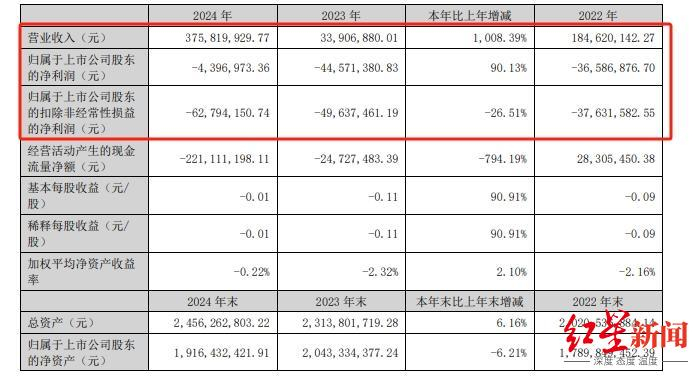 一方面,公司2024年度经审计的利润总额为349.33万元、净利润为-1,622.48万元、归母净利润为-439.70万元,扣除非经常性损益后归母净利润为-6,279.42万元,扣除后的营业收入为3.7亿元。