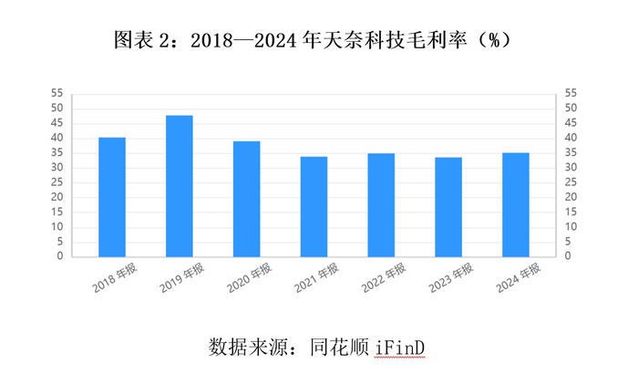 2024年下半年以来,天奈科技毛利率略有下滑,或与竞争加剧有关。从单季度来看,天奈科技在2024年第二季度、第三季度、第四季度及2025年第一季度的毛利率分别为38.80%、34.10%、33.75%、33.19%,呈逐季下滑的趋势。