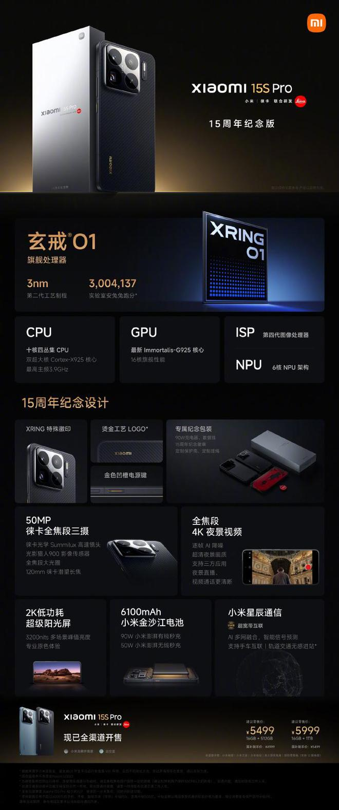 小米手机:小米15S Pro发布,售价5499元起 网易新闻 2025.05.2219:40 关注 5月22日,小米15周年战略新品发布会上,小米15S Pro发布,售价5499元起。首发搭载“玄戒O1”3nm旗舰处理器。