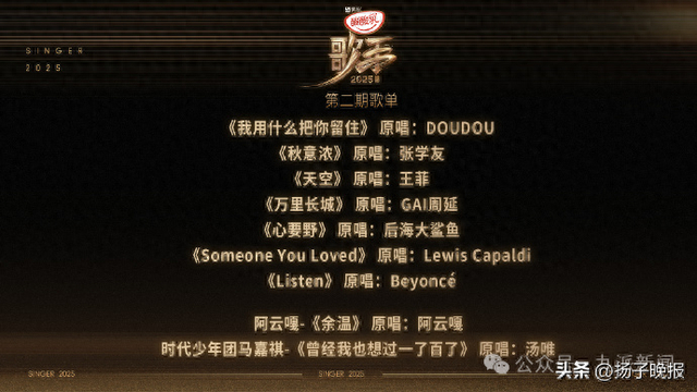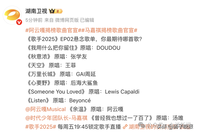 5月22日,@湖南卫视 公布《歌手2025》第二期歌单。