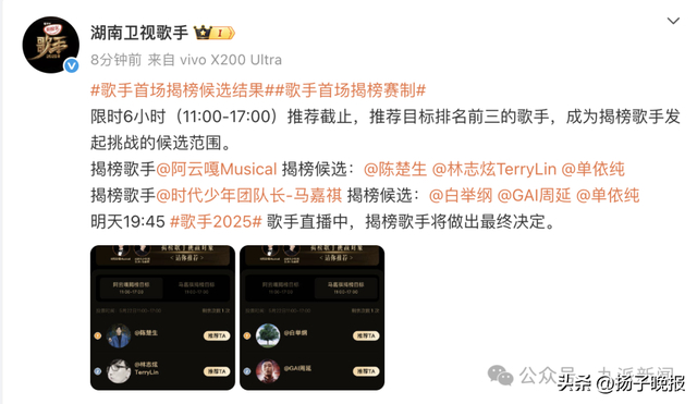 另据此前报道,阿云嘎揭榜候选:陈楚生、林志炫、单依纯;马嘉祺揭榜候选:白举纲、GAI、单依纯。