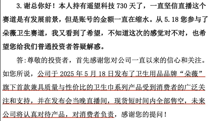 4000万销售额现货全部售罄、直播间订单量超80万单、直播间曝光量突破5500万——这是黄子韬主理的卫生巾品牌“朵薇”5月18日晚间正式上线发售获得的亮眼成绩。当天,遥望科技董事长兼CEO谢如栋作为朵薇品牌的合伙人之一也出现在现场。
