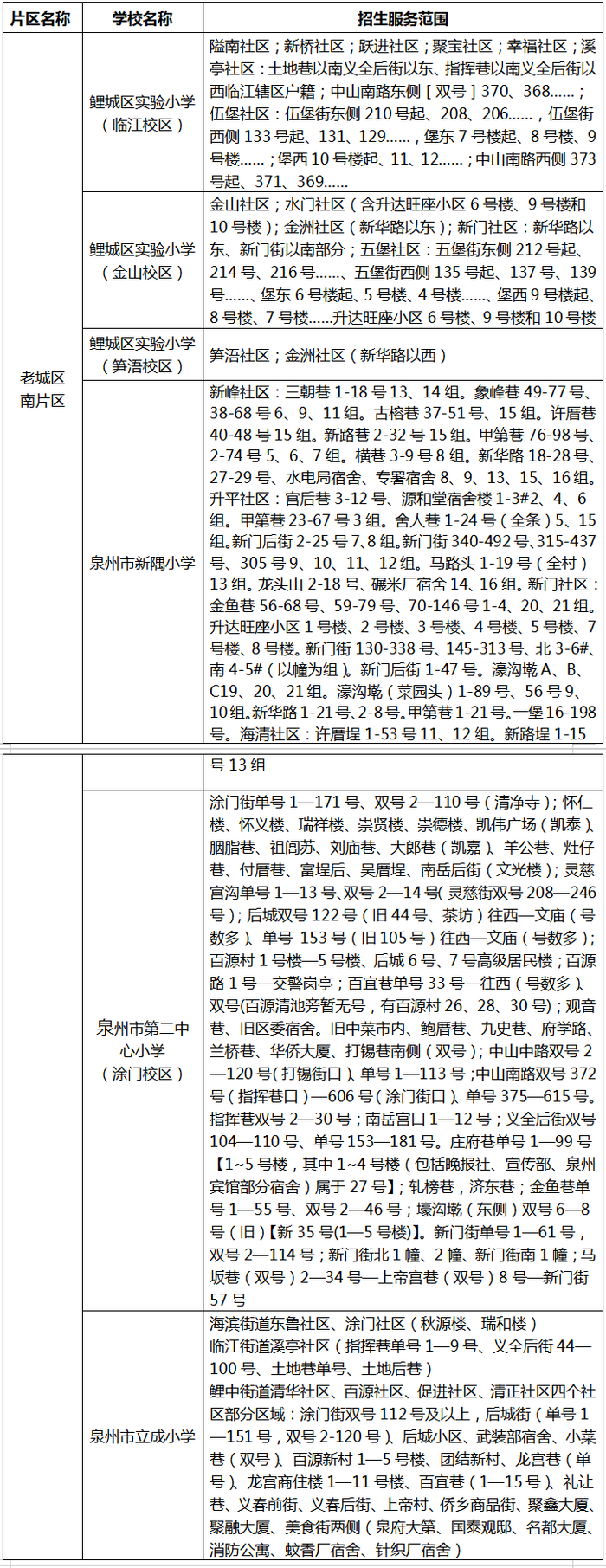 (三)鲤城区各公办小学招生服务范围