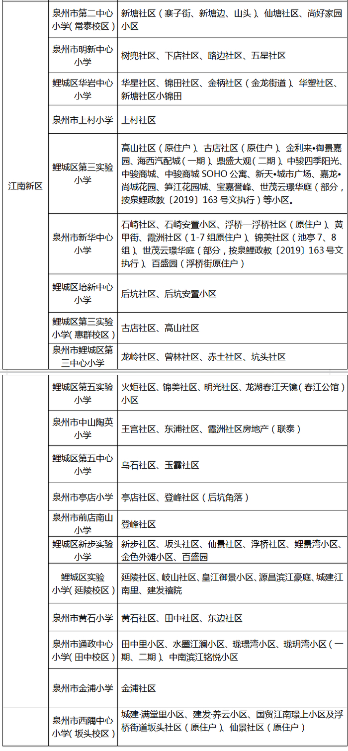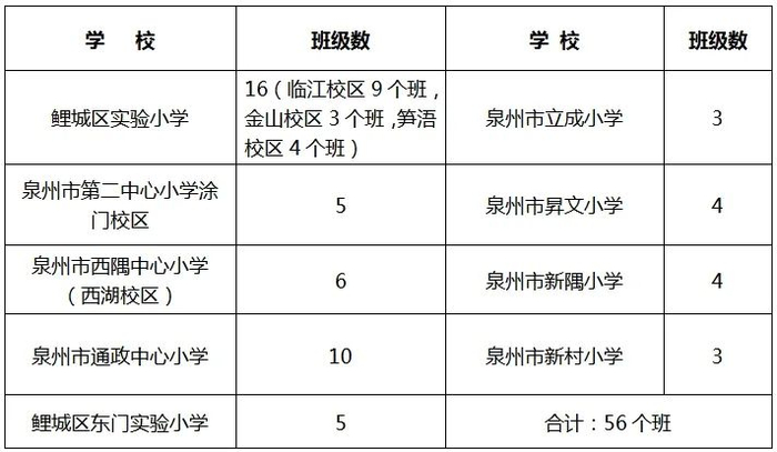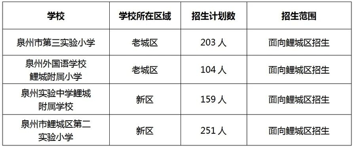 南片区:鲤城区实验小学(含金山校区、笋浯校区)、泉州市第二中心小学、泉州市立成小学、泉州市新隅小学等4所公办小学;
