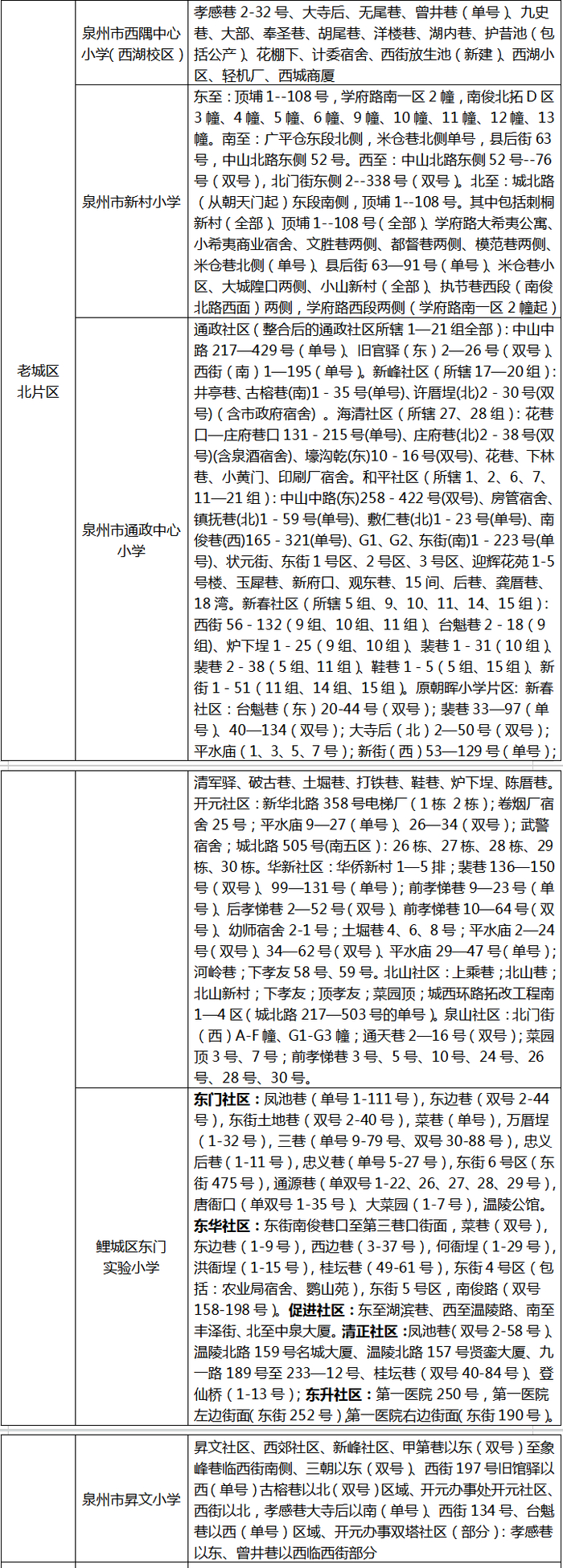 北片区:泉州市通政中心小学、泉州市昇文小学、泉州市西隅中心小学、鲤城区东门实验小学、泉州市新村小学等5所公办小学。