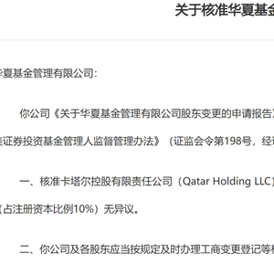 今日傍晚,证监会发布《关于核准华夏基金管理有限公司变更持股5%以上股东的批复》。批复称,核准卡塔尔控股有限责任公司(Qatar Holding LLC)成为华夏基金持股5%以上股东;对卡塔尔控股有限责任公司依法受让华夏基金2380万元人民币出资(占注册资本比例10%)无异议。