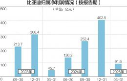 比亚迪2025年一季度业绩报告显示,报告期内,公司出现逆势增涨,实现总营业收入约1703亿元,同比增长36.35%;实现净利润91.55亿元,同比增长100.38%。