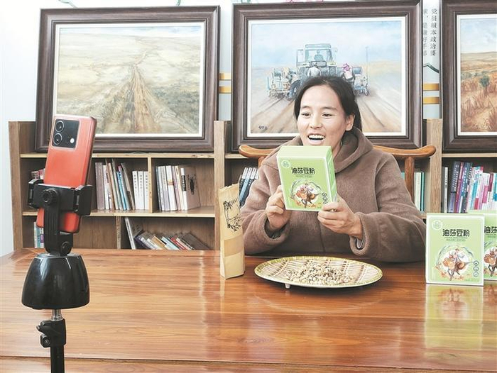 三师五十四团二连职工在直播销售油莎豆(资料图片)。五十四团积极完善品牌服务管理体系,拓宽产品销售渠道,不断提升油莎豆产品的品牌竞争力和影响力。 兵团日报全媒体记者 常丫丫 摄