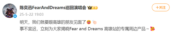 22日晚,陈奕迅巡回演唱会官方微博发文:“明天,我们就要跟高雄的朋友见面了!”