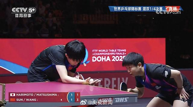 2025多哈世乒赛混双1/4决赛,王楚钦/孙颖莎在先丢一局的情况下连扳三局,以3-1逆转日本组合松岛辉空/张本美和,晋级四强。四局比分为6-11、11-9、11-9和11-9。
