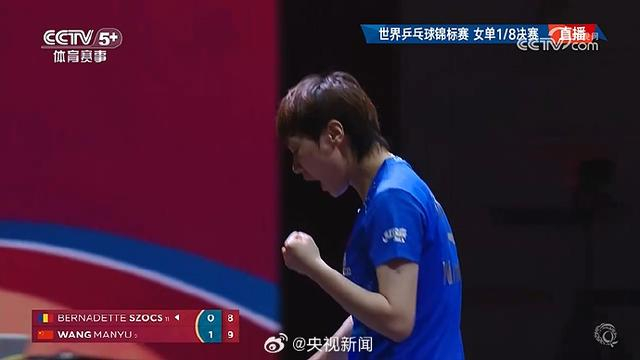 在世乒赛1/8比赛中,2号种子王曼昱直落四局,淘汰罗马尼亚选手伯纳黛特·斯佐科斯,晋级8强。四局比分为:11-6、12-10、11-5和11-6。