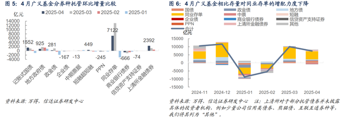 4月广义基金托管增量较上月大幅下降5494亿元至11556亿元,这主要受到了对同业存单的增持规模大幅下降的影响。此外,广义基金对地方债、政金债的增持规模也有所减少,但对上清所金融债券、国债、短融券的增持规模均上升,减少了对商业银行债券的减持。相对存量,4月广义基金对债券的增配力度同样下降,但幅度不大,主要是对同业存单的增配力度下降,对政金债、地方债的增配力度也有所减弱,但对国债的增配力度上升。4月广义基金对同业存单、地方债和政金债的增持规模分别下降至7122亿元、925亿元、281亿元,转为减持中票13亿元、信贷资产支持证券74亿元,对企业债的减持规模上升至167亿元,但对上清所金融债券、国债、短融券的增持规模上升至2392亿元、1552亿元、449亿元,对商业银行债券、PPN的减持规模下降至666亿元、245亿元。相对存量,4月广义基金对债券的增配力度同样下降,主要是对同业存单的增配力度大幅下降,对地方债和政金债的增配力度也有所减弱,对中票的减配力度上升,但对国债的增配力度增强,对上清所金融债券也转为增配。分机构来看,基金公司对长端国债、中票和地方债的增持规模均上升,但减少了对政金债和同业存单的增持,理财产品主要是增加净买入同业存单,但对短端政金债的增持规模下降,其他产品对同业存单和长端政金债的增持规模大幅上升,对长端国债转为增持,货币基金对同业存单的增持规模大幅下降,对国债的增持规模也小幅减少,但增加了对短融券的增持。