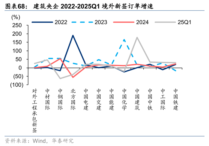 从海外市场开拓来看,四大国际工程相较八大央企业务规模较小,境外收入占比较高,均在48%以上。八大建筑央企中,中国化学24年境外收入占比最高约25%,较23年占比继续提升5pct,中国交建次之约18%,中国电建和中国能建则分别为14%/13%。新签订单是市场开拓的领先指标,23年建筑央企境外新签订单普遍提速,24年及25Q1维持较好景气。四大国际中,中材国际、中钢国际和中工国际23-24年境外新签订单保持较好增长;八大央企中,中国交建、中国能建、中国建筑、中国中铁23-25Q1境外新签增速均持续表现较好,中国铁建则24-25Q1境外新签实现连续20%以上增长,中国化学23-24年境外新签分别实现增速165%/13%,25Q1由于高基数影响短期同比-20%。
