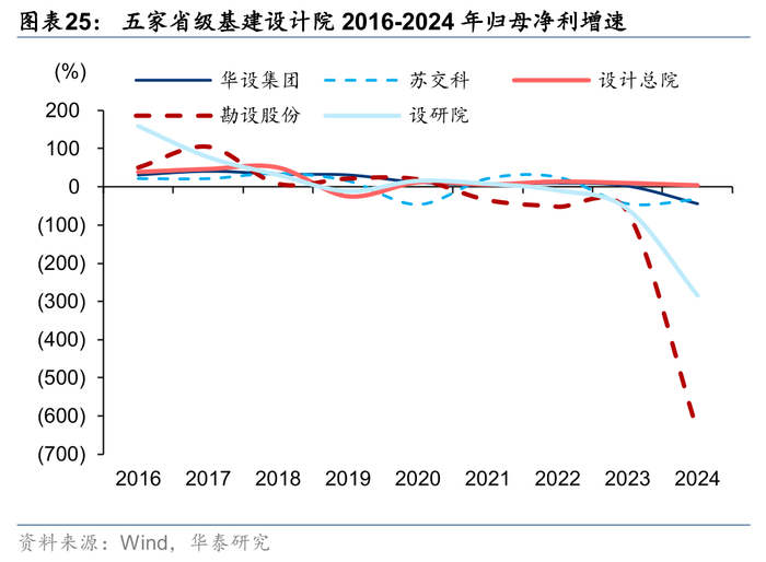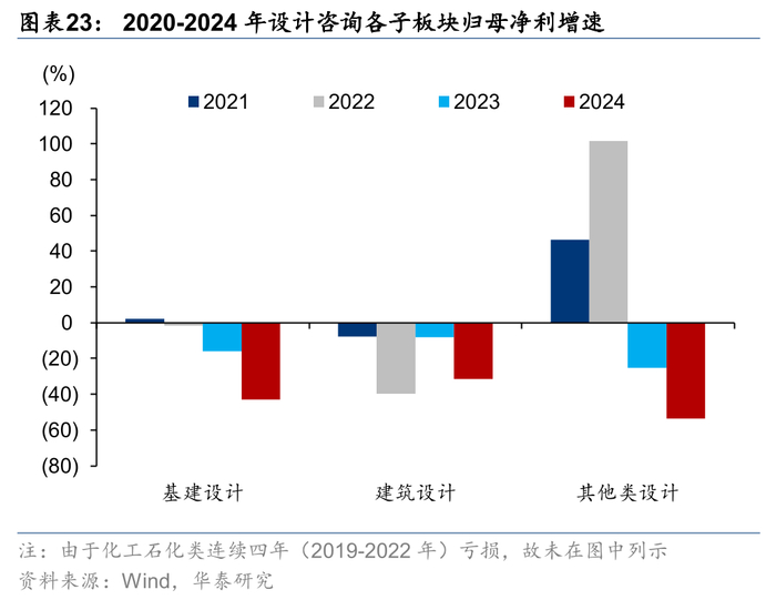 设计子板块业绩普遍下滑较多。总体来看,设计咨询板块24年收入同比增速-3.1%,归母净利同比增速-50.7%。分子板块看,24年仅基建设计同比实现0.51%的增长,归母净利润方面,化工石化类受单一企业影响较大,继子板块连续四年亏损后,2023年实现扭亏为盈,2024年再次大幅下滑,其余设计子板块受传统基建放缓、地产需求减少、减值增加等影响,业绩均出现较大幅度下滑。