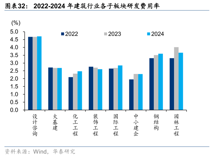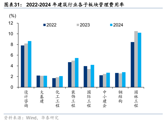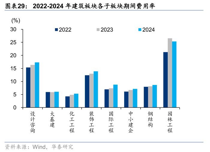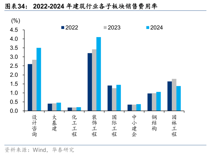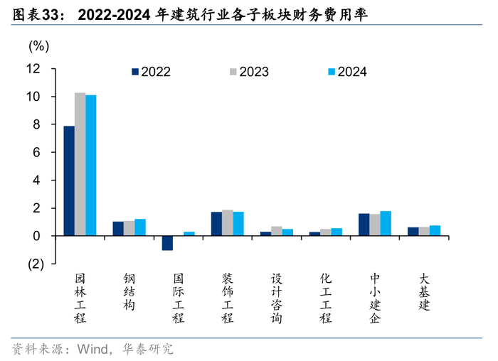 收入承压,24年子板块销售、管理费率除园林工程外均有所增加,财务费用率和研发费用率增减不一。装饰工程和设计咨询销售费用率增幅较多,同比提升0.68和0.67pct,园林工程销售费用率同比下降0.40pct。园林工程板块近年管理费用持续下降,但此前20-23年受困于收入下滑比例较大,管理费用率增长显著,24年首次实现同比下降。其余板块中,国际工程管理费用率增幅最高为0.78pct,其次为装饰工程和设计咨询,分别为增加0.48和0.46pct。应对收入降低,子板块研发费用普遍收缩,园林工程、装饰工程和中小建企实现研发费用率同比降低,大基建板块基本持平,国际工程研发费用率仍为提升最多的子板块,同比增加0.17pct。国际工程和中小建企财务费用率提升较多,分别+0.25/0.21pct,前者主要系汇率波动,汇兑收益同比减少影响,后者主要系收入下降较多。大基建板块财务费用同比增长13%,费用率同比增加0.11pct,主要系现金流压力较大,导致带息负债增加较多所致。
