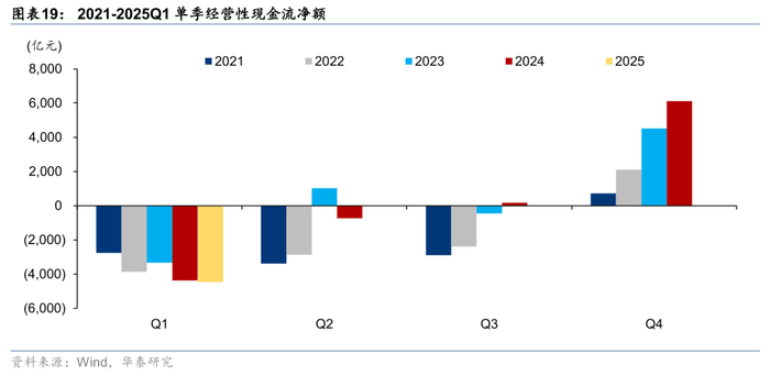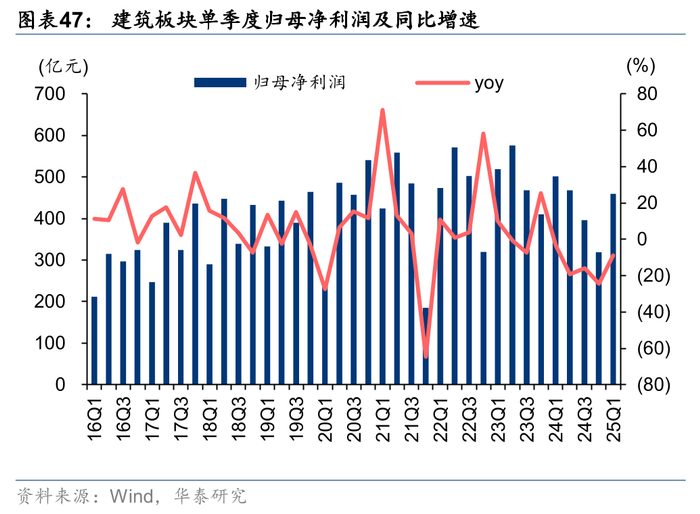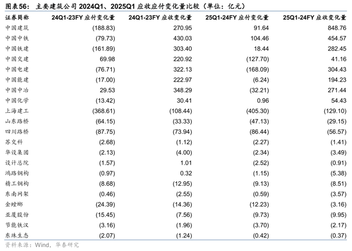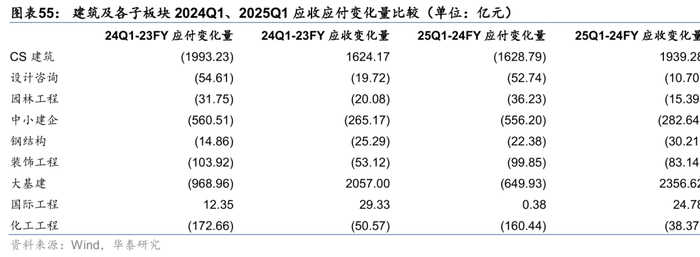 Q1通常由于春节前后错峰支出,会形成较多新增应收类资产,应付类资产增加较少或减少。我们用指标(期末应付票据及应付账款-期初应付票据及应付账款)代表建筑公司的清欠力度,用指标(期末应收票据及应收账款-期初应收票据及应收账款)代表建筑公司的清收力度。25Q1建筑板块应付款较24年末减少1629亿元,而24Q1建筑板块应付款较23年末减少1993亿元;而清收角度,25Q1建筑板块应收款较24年末增加1939亿元,24Q1建筑板块应收款较23年末增加1624亿元,我们认为大基建承担更多社会责任,25Q1收款减少应收增加是板块CFO净流出增加的主要原因。