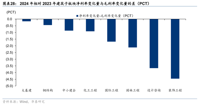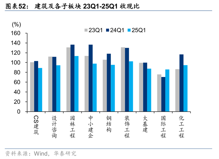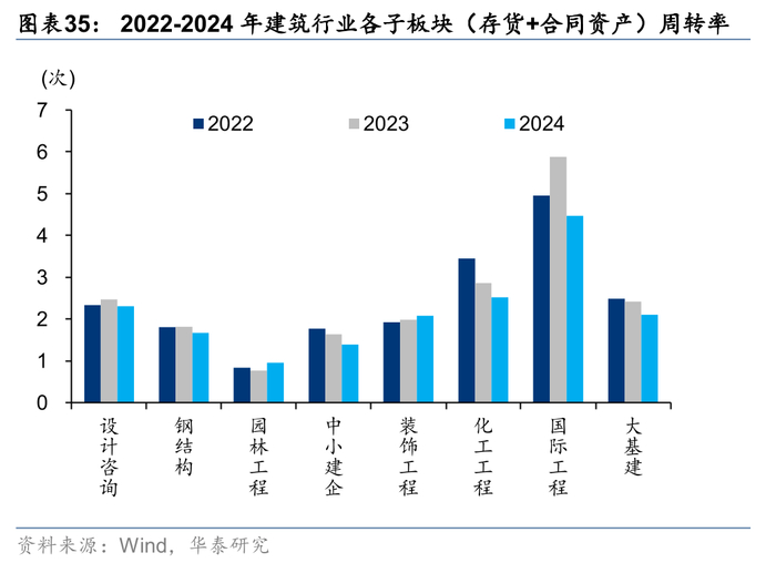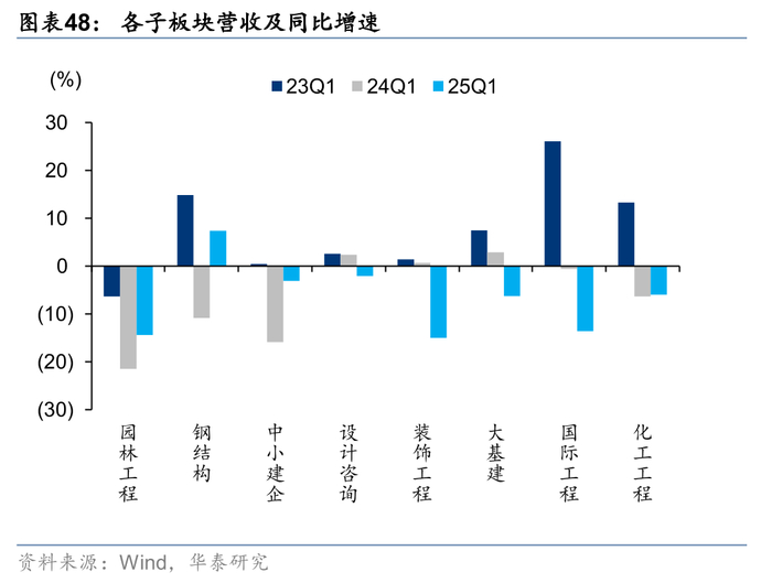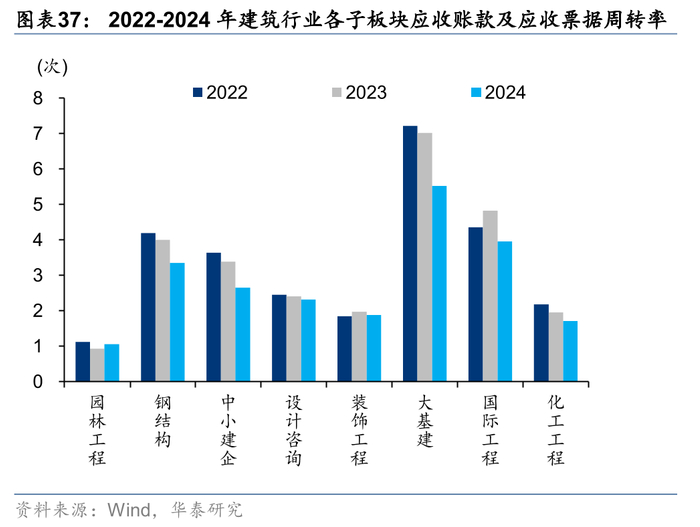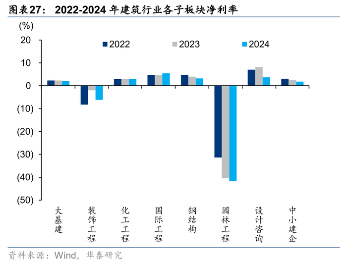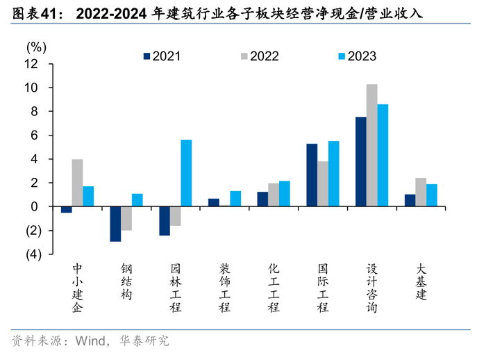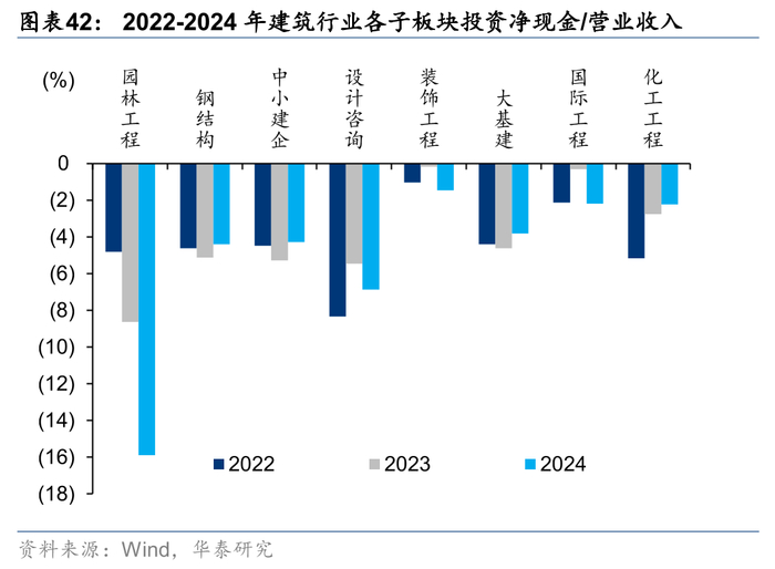 除园林及装饰工程外,各板块存货周转水平均出现下降。园林和装饰工程此前资产负债表受损较重,经过多年的缩表修复,24年存货周转率分别提升0.19/0.09次,国际工程下降最多1.41次,化建和大基建其次,分别下滑0.34/0.31次。从当期(存货+合同资产)较年初净增量占营业收入比重指标看,仅大基建同比提升0.13pct,其余子板块均实现下降,我们认为主要系央国企应收增加的同时,在政策要求下需加强对中小民企支付,导致现金流出压力较大。