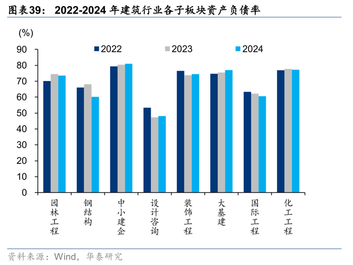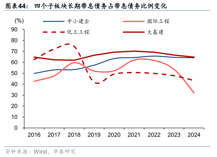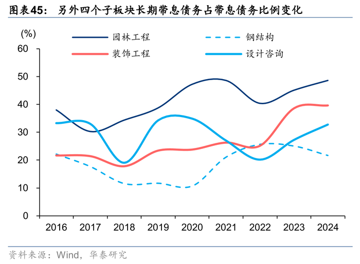 大基建、国际工程和化建板块自21年以来长期有息负债占有息负债比例持续降低,设计咨询、园林和装饰工程24年同比提升。我们以长期借款和应付债券之和作为长期有息负债,长债占比靠前的子板块分别是大基建、中小建企和园林工程,分别为64.7%/64.1%/48.5%,国际工程24年同比显著降低21.43pct至32.2%,主要系北方国际偿还到期的长期借款影响板块。我们认为对于大型、投资类项目收入占比较低的子板块,如钢结构、设计咨询等,其有息负债大多只用于短期的经营性垫款,故长期有息负债占比较低。