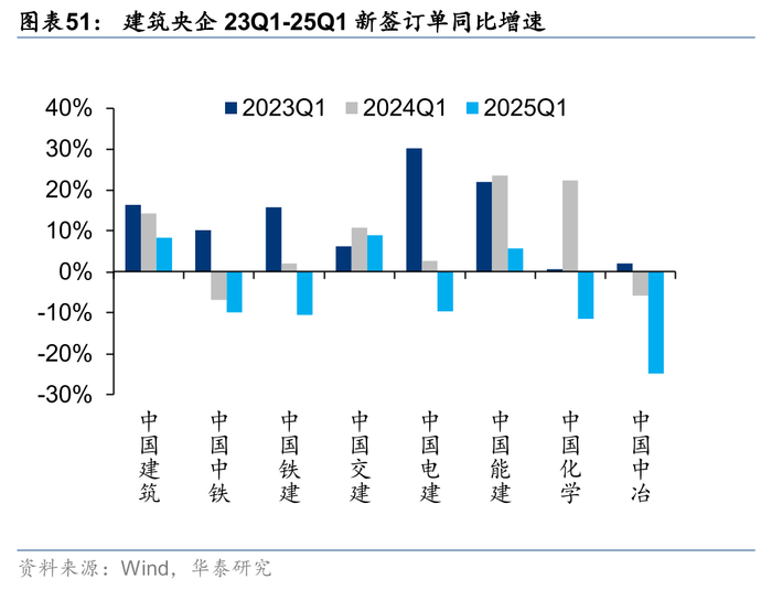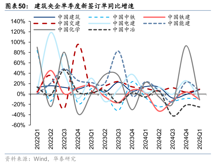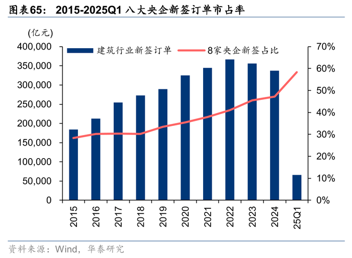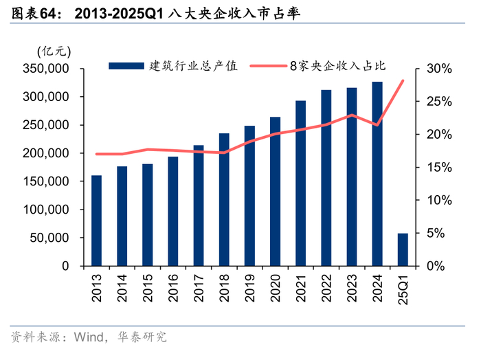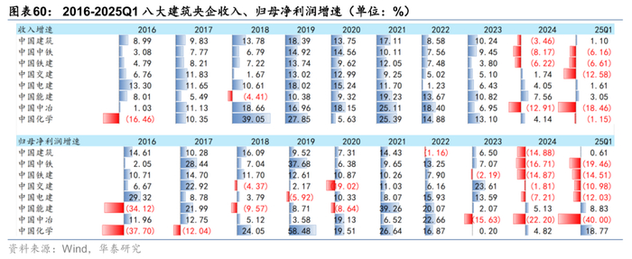 龙头市占率持续加速提升。建筑工程商业模式中融资成本、技术实力和管理边界决定了建筑国企,尤其建筑央企的市场份额将持续提升。18年受信用环境收紧影响,民企融资难导致建筑行业19年集中度提升已出现一次加速现象,21年地产信用风险导致大量中小建筑企业被动出清,22年以来在稳增长助力下行业新签订单、收入集中度继续上行,23年以来在地产需求承压、地方政府聚焦化债的背景下,央国企具备较强资金实力承担更多责任,行业集中度提升再次提速,24年由于公路市政等传统基建投资不足,部分以此为主业的央企收入受损较多,导致市占率有所下降,25Q1显著回升。根据对八家建筑央企统计,25Q1收入市占率较22年提升6.6pct至28.2%,新签订单市占率则提升17.4pct达到58.4%,我们认为订单的更快速度提升预示央企未来收入份额有望继续提升。