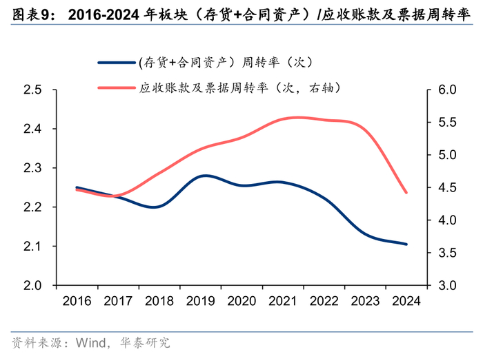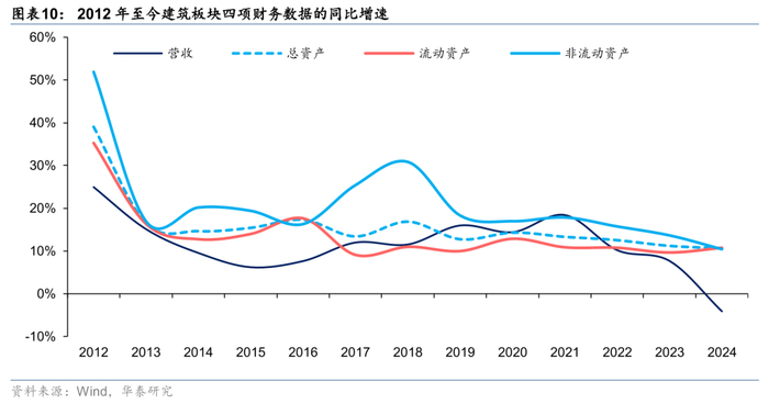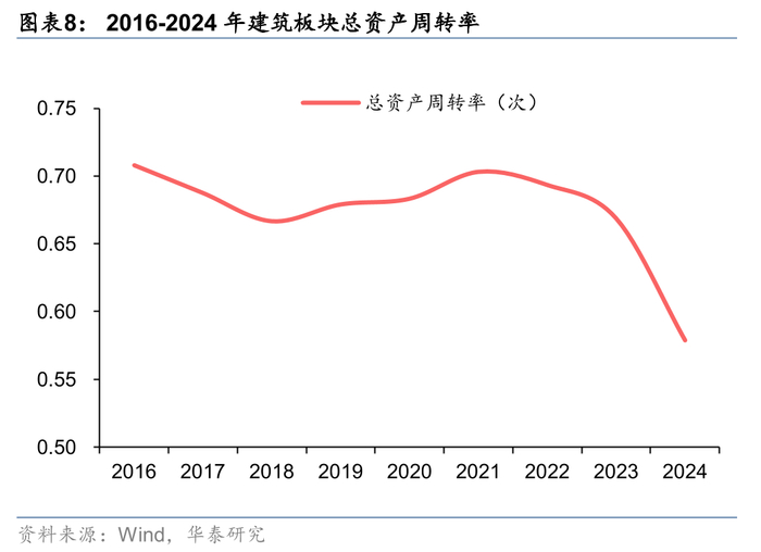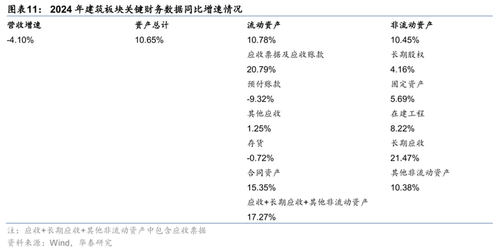 24年板块主要周转率降低,受应收类资产增加影响,总资产同比增长10.8%。18年开始部分企业逐步按最新会计准则,将原包含在存货科目中的“已完工未结算存货”重分类计入“合同资产”项下,因此我们将合同资产加回至存货处理,考虑到应收票据占建筑企业应收项目比重持续提升,我们在计算应收账款周转率时也加回应收票据。24年建筑板块总资产周转率0.58次,同比下降0.09次,应收账款及票据周转率4.42次,同比下降0.96次,(存货+合同资产)周转率2.11次,同比下降0.02次。24年建筑板块总资产同比增长10.8%,营收下滑4.10%,因此总资产周转率同比继续下降。从资产增长的因素看,随着投资类项目支出增长放缓,2021年以来,总资产增速与非流动资产、流动资产的增速均较为同步,其中2024年非流动资产增速首次低于总资产增速。