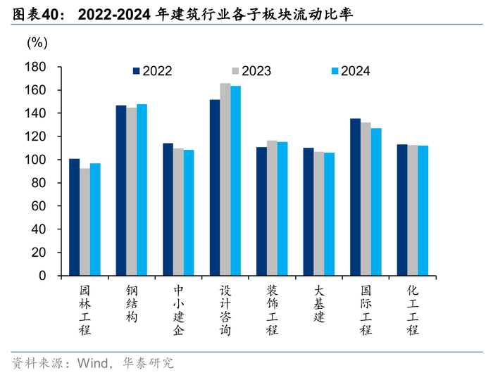 24年基建链相关板块资产负债率显著提升,园林工程和钢结构流动比率同比提升。资产负债率方面,受地方政府财政压力约束,项目回款放缓,基建链杠杆被动提升,其中大基建提升最多达1.61pct,设计、装饰和中小建企分别提升0.83/0.77/0.54pct,其余子板块同比下降;园林及钢结构在流动比率方面表现出短期偿债的能力提升,国际工程流动比率同比降低较多,主要系流动负债增加,但整体流动比率在各子板块中仍处于第三的较高水平。