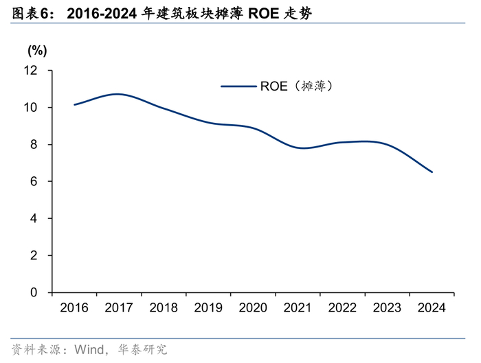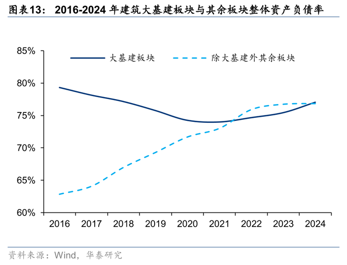 2024年建筑板块资产负债率同比继续上升,央企、国企承担稳增长、对下支付等社会责任背景下被动抬升较多,民企趋于平稳。建筑板块24年整体资产负债率77.0%,同比提升1.3pct。我们注意到,大基建板块(包含中国建筑、中国交建、中国铁建、中国中铁、中国电建、中国核建、中国中冶、中国能建、隧道股份和上海建工,10家公司24年末总资产占整个建筑板块81.7%)在24年整体资产负债率上升1.61pct,在剔除这10家公司后,建筑板块24年资产负债率76.8%,同比微增0.07pct,民企逐步渡过被动抬升杠杆阶段,趋于平稳。我们预计25年化债、专项债、特别国债等资金支持下,地方政府资金状况或迎来边际改善,但总体仍较为紧张,在民企大量退出行业、要求清欠的背景下,央国企预计仍将承担行业主要杠杆压力。