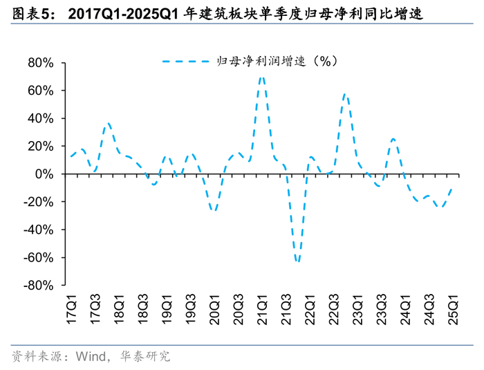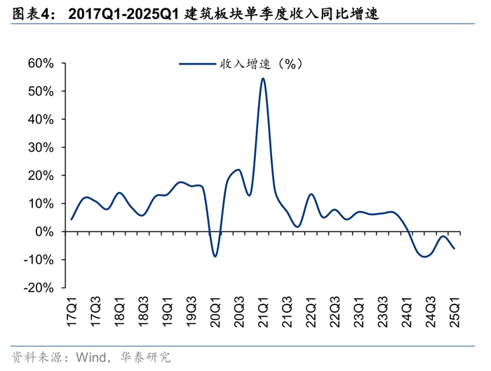 25Q1政策尚未完全发力,收入、归母净利高基数下同比下滑。25Q1建筑板块单季度营收/归母净利同比增速分别为-6.0%/-8.8%,同比-7.3/-5.4pct,我们认为一方面24Q1基数相对较高,另一方面稳增长、化债等政策落地见效需要时间,25Q1开工恢复慢于往年同期,导致实物量转化仍显弱势。根据TOP4数据,25Q1单季度营收/归母净利同比增速分别为-4.0%和-8.4%,收入/归母净利增速高于行业2.0/0.4pct,我们判断随着特别国债、专项债等资金加快落地,叠加基数走低,板块业绩有望迎来逐季上行改善。