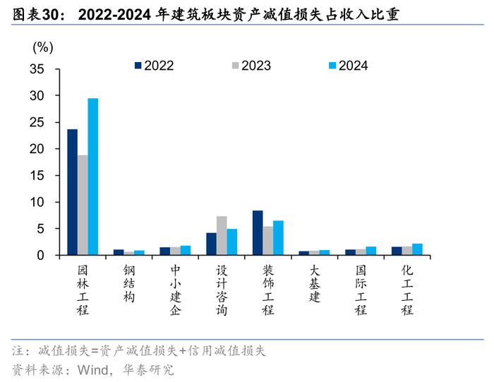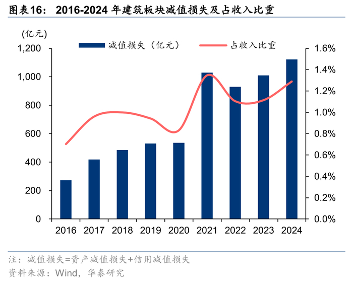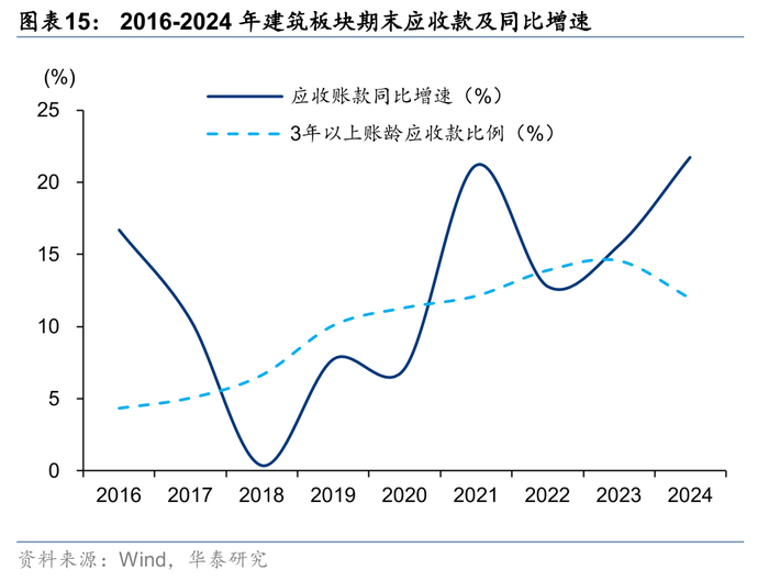 应收账款增加,整体减值压力提升,长账龄应收占比降低。我们将资产减值损失和信用减值损失相加统称为减值损失。24年建筑板块减值损失1123亿元,同比增长11.2%,减值损失占收入比重1.29%,同比+0.18pct,我们判断主要系一方面地产链仍存在减值压力,另一方面地方政府资金压力较大,项目进度款支付放缓,导致企业应收账款增加较多。24年整个板块的应收账款同比增加21.7%,增速相比23年进一步提升6.11pct,主要系1年以内账款增加较多,三年以上应收款所占比例因此同比-2.62pct至12.0%。