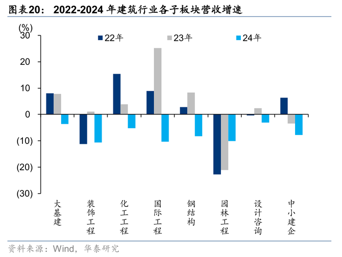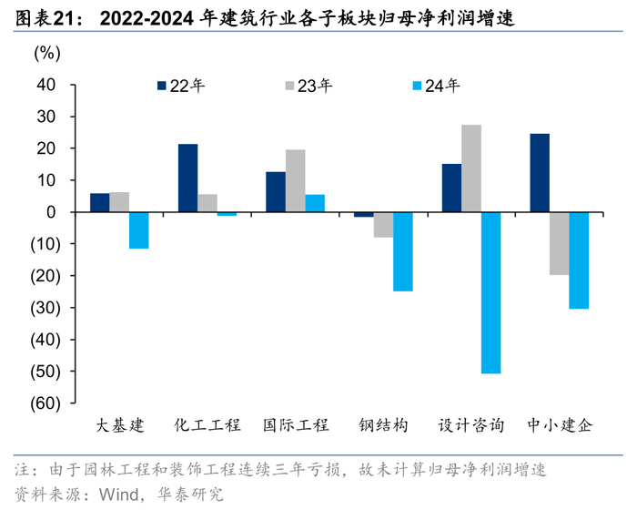 24年建筑子板块收入均出现下滑,归母净利润仅国际工程取得了同比增长,其余子板块中化工工程(以下“化工工程”称“化建”)利润下滑幅度最小。24年子板块归母净利润同比增速按增速排名分别为国际工程、化建、大基建,同比增速分别为5.5%/-1.2%/-11.5%。从收入来看,24年子板块均出现同比下滑,设计咨询、大基建、化建下滑幅度相对较低,分别为-3.1%/-3.6%/-5.2%。受基建投资趋缓、地产行业恢复偏慢等影响,各子板块收入、利润同比承压,国际工程随着海外业务占比提升带动利润率改善,收入虽有下滑但利润稳健增长;化建下滑较少主要系板块中规模占比较大的中国化学受益于海外石油石化景气度较好,收入、利润实现稳定增长;大型央国企在积极发展海外市场、国内龙头集中的背景下,经营韧性高于行业;中小企业、民营企业经营压力显著增加,利润下滑幅度远高于收入。