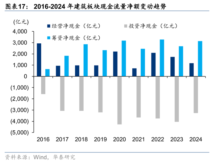 子板块中园林工程、装饰工程、中小建企和钢结构实现现金流管理的改善,大基建经营性现金流流入承压,投资性流出同比减少。24年所有子板块均实现经营性现金净流入,园林工程、装饰工程、中小建企和钢结构实现经营性现金流同比改善,我们认为主要系民企聚焦收缩报表,受到化债、清欠等政策支持更为显著,大基建流出压力较大,承担稳增长、中小企业清欠重任,同比少流入617亿元,净额占营收比例降低0.78pct。投资性现金流方面,大基建、中小建企、钢结构和化建投资性现金流出同比减少,中小建企和大基建占营收绝对比重下降较多,分别为1.0/0.8pct,主要系PPP等投资类项目减少所致。