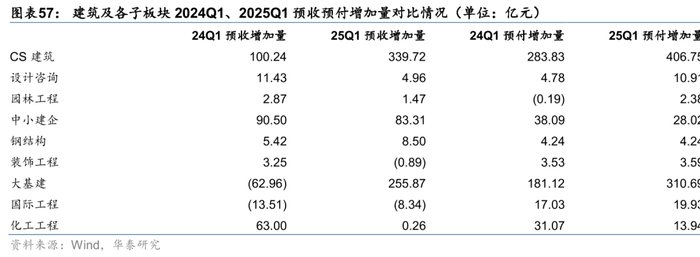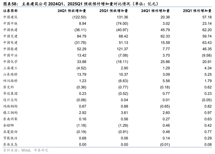 25Q1预收预付端变化体现出大基建订单或有好转,施工节奏有望逐步改善。我们用指标(期末预收账款-期初预收账款)表征预收增加情况,指标(期末预付账款-期初预付账款)表征预付增加情况。25Q1建筑板块预收账款1.27万亿元,较24年末增加340亿元,25Q1末预付账款2997亿元,较24年末增加407亿元,其中大基建预收增加256亿元,预付增加311亿元。我们认为预收款增加较多显示大基建新签订单质量或有提升,预付款增加预示未来实物量或有望改善。