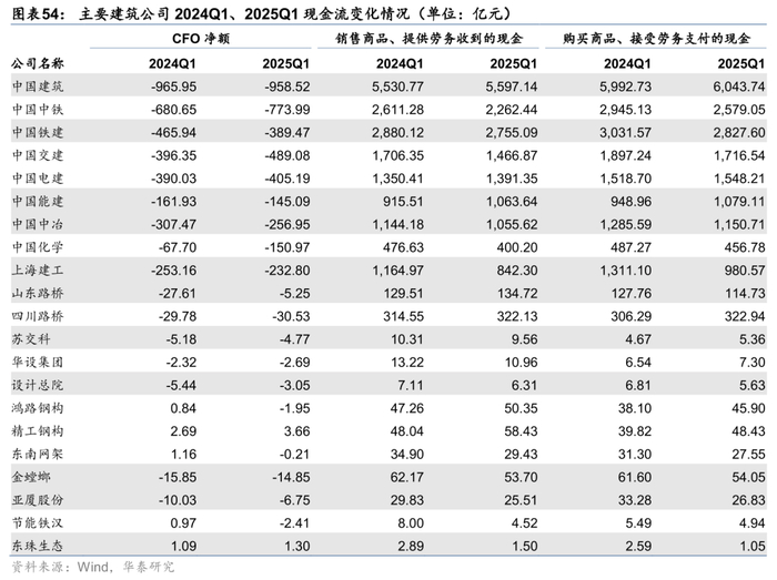 现金流角度,受业务模式影响,建筑板块一季度CFO仍呈现净流出状态,但25Q1同比流出增加。25Q1建筑板块CFO净流出4447亿元,同比多流出73亿元,其中销售商品、提供劳务收到的现金同比减少1056亿元,购买商品、接受劳务支付的现金同比减少1176亿元。主要追踪的公司中有所分化。
