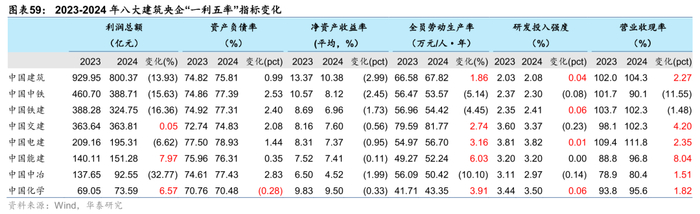 央国企承担更多稳增长、清欠支持民企发展等重任,营收下滑幅度低于行业,但由于现金流支付压力增加大于化债回款好转,导致央企普遍呈现出较大盈利能力、利润、现金流以及杠杆压力,提质增效导向下劳动生产率多有提升。以八大建筑央企作为样本,24年“一利五率”经营指标中,利润总额5家下滑,资产负债率7家上升,净资产收益率均下滑,全员劳动生产率5家提升,研发强度4家提升,营业收现率6家提升。