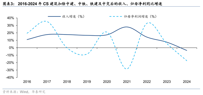 2015-2024年间年度营收首次下滑,归母净利受损较多。2024年CS建筑板块实现营收8.7万亿元,同比增速-4.10%,实现归母净利润1689亿元,同比增速-14.40%。2015-2024年间,行业首次出现年度营收同比下滑,利润方面下滑幅度超过2021年受疫情影响导致的下滑水平(-2.38%),主要系受房地产施工下滑、传统基建投资增速放缓导致收入承压,而费用刚性、回款压力增加导致账期拉长影响企业计提减值压力增大,进一步影响盈利能力。2024年建筑板块归母净利增速与营收增速剪刀差为-10.30pct,较23年-9.55pct。业务结构调整叠加降本增效下,行业毛利率继续提升,但归母净利率继续下降,2024年板块毛利率10.96%,同比+0.05pct,净利率2.44%,同比-0.29pct,归母净利率1.94%,同比-0.23pct。