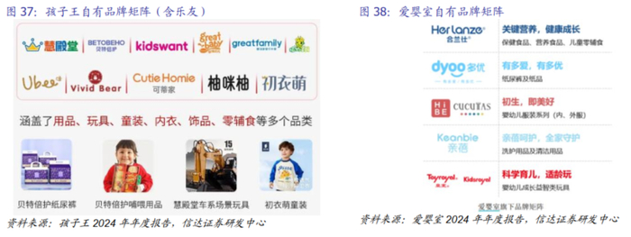柔性生产匹配母婴消费场景化,敏捷响应用户个性化需求。当前母婴产业供应链为适应市场变化,多为可持续供应链模式,施行小批量多批次生产,以符合市场多变的消费趋势。行业头部公司通过前期经验积累,推行 C2M 反向定制机制,联合供应商搭建数字化协同平台,缩短订单响应周期。此外,行业公司重视自有品牌建设,头部公司已形成自有品牌矩阵,叠加成熟专业的渠道能力加持,增强与品牌方及生产方在专供商品上的议价能力,以提升利润。通过数字化手段持续优化供应链体系:孩子王依托智能化采购系统提升采购效率,通过订单管理系统实现最优物流交付,其供应链优势显著。2024年公司差异化供应链实现销售收入10.02亿元,占母婴商品收入比重为12.3%,当前孩子王与乐友国际共有11大自有品牌,涵盖母婴童主要品类,2024年其自有品牌交易额同比增长33.24%,自有品牌收入占差异化供应链销售收入比例达61%。爱婴室则通过SRM平台实现与供应商的数据共享。公司基于会员数据分析优化区域仓商品结构,2024年电子商务业务收入占比提升至20.8%。两家企业均通过数字化手段实现供应链效率提升,孩子王侧重生态协同创新,爱婴室强化数据驱动运营。