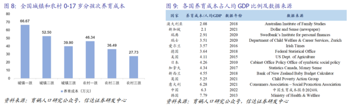 育儿成本关联家庭收入,中国育儿成本领先全球。据《中国生育成本报告2024》,全国0-17岁孩子平均养育成本53.8万元,城镇一孩达66.7万元,农村一孩为46.3万元。中国养育成本占人均GDP比例达6.3倍,远超德国的3.64倍和美国的4.11倍。