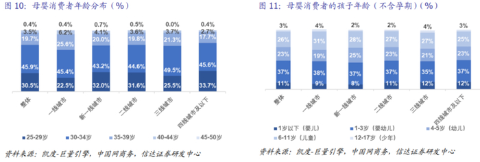 育儿费用为有孩家庭固定开支项目,家庭消费观念决定支出水平。据凯度-巨量引擎调研数据。一线和新一线家庭育儿需求更为多样化和高质量,整体家庭愿意为育儿资源支出较高;二线城市家庭受收入水平影响,整体花费较为均衡,保持中等水平;三线城市家庭则成分化态势,部分家长重视投资教育资源,而部分家长在其他育儿方面投入则较为节俭;四线城市家庭因整体生活成本较低,因此在育儿侧的花费也较低。当前母婴消费主力多为30-34岁的90后群体,其孩子的年龄分布也多集中在3岁以下的婴幼儿时期,此时期正是大量消耗婴童基础产品如奶粉、纸尿裤的状态,因此家庭消费观念决定整体支出水平。