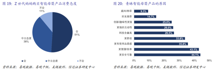 母婴童产品进行科技化融合及个性化定制,技术迭代与消费升级双向拉动。产品层面,随着科技的进步,母婴产品也变得更加智能化与便捷化。当前AI玩具已经具备语音交互功能,能给予情感回应及安抚陪伴,而机器人玩具已具备高度的互动性和自主性,可通过语音、动作、表情等进行互动,促进婴幼儿智力开发。据易观数据,51%的Z世代妈妈表示更倾向于购买智能母婴产品,因其更安全可靠且更便捷提效。消费者也越来越愿意为增值服务付费,如年轻家长认为陪伴型AI玩具能够提供即时陪伴,缓解育儿压力;而早教型AI玩具则能够激发出婴幼儿的学习兴趣并培养情感交互能力,家长对科技产品的支付意愿增强。