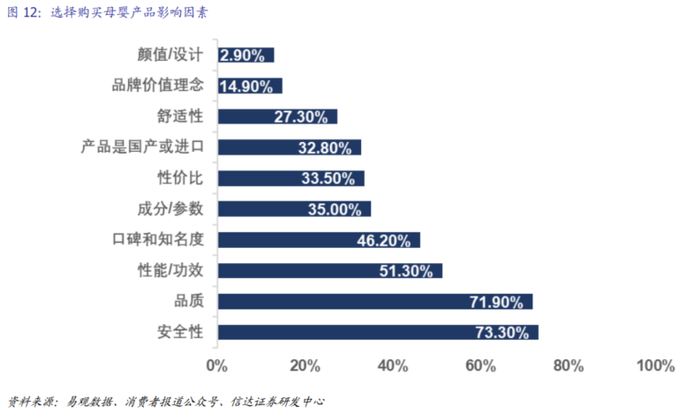 安全性及品质受重视,性价比和品牌营销引共鸣。据易观数据,中国母婴消费者在购买产品时更看重商品的安全性、品质及实用性,行业整体消费规模的上升也是因为该类消费者对于价格敏感度相对较低。对此品牌侧感知显著,消费者依然偏好品质更好的品牌,下线市场需求空间较大。而高性价比及具备情绪价值的产品,如设计层面的巧思及使用层面的便利性,也将更容易吸引母婴消费者关注。品牌和渠道如何通过适合的营销引起更多的消费者共鸣从而形成转化,是当前行业最核心的问题之一。