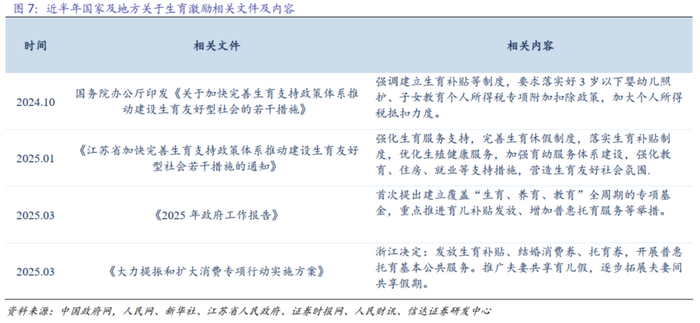 国家和地方政府积极推出生育激励政策,降低生育养育成本,健全生育配套。2025年以来全国及各地方在生育激励及相关生育配套政策方面持续发力,旨在减轻家庭生育养育负担,营造良好的生育环境,推动建设生育友好型社会。2025年政府工作报告明确提出制定促进生育政策,发放育儿补贴,大力发展托幼一体服务,增加普惠托育服务供给。这表明国家在宏观层面进一步加大了对生育的支持力度,通过直接的经济补贴和托育服务的优化,为家庭提供更全面的生育支持。此外,卫生健康委正在会同有关部门起草相关育儿补贴的操作方案,未来将会有更多直接惠民的措施和政策安排。在税收政策方面,已将3岁以下婴幼儿照护、子女教育费用纳入个人所得税专项附加扣除,扣除标准从每个子女每月1000元提高到2000元,这一政策的调整,能够有效减轻家庭在生育和养育过程中的经济负担,提高家庭的生育意愿。在医疗保障方面,截至2024年10月30日,全国已有共27个省份及新疆生产建设兵团发文将辅助生殖技术纳入医保报销范围,剩余省份也在加快推进相关工作。这一措施将较大地减轻有生育需求但面临生殖障碍的家庭的经济压力,提高生育成功率。