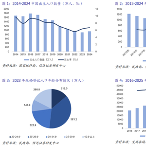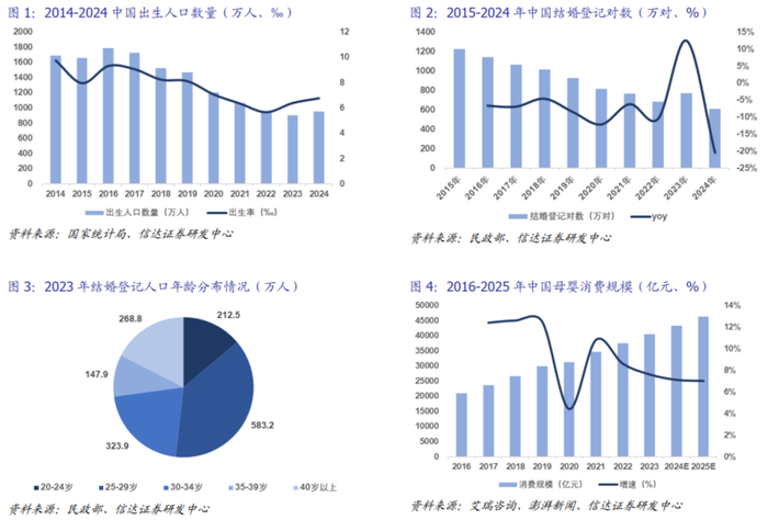 人口生育率走低,但母婴消费规模持续上升。据国家统计局数据,2019-2023年全国人口出生率持续走低,尤其在2020年后下降更为明显,其中2022年人口出生率仅为5.67‰,2024年全年出生人口数量954万人。结婚对数直接决定了出生人数,据民政部数据,2024年结婚人数创历史新低,但从出生人口数量较23年增加超50万,可见生育意愿有所改善。从2023年结婚登记人口年龄分布来看,29岁(94年后出生)以下人数占比超50%,可见95后Z世代逐步成为母婴市场主力人群。年轻一代新家庭重视育儿理念或引发育儿需求的新增长,叠加家庭消费能力的提升,中国母婴市场消费规模或将保持稳定增长趋势,据艾瑞咨询数据,预计2025年中国母婴消费市场规模将超过4.6万亿元。