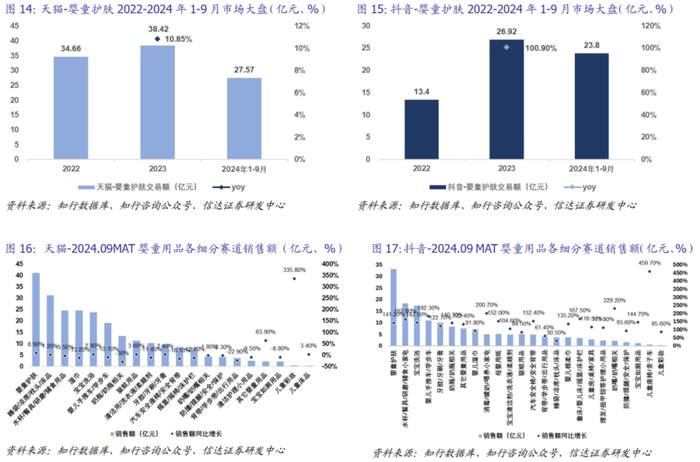 婴童护肤表现突出,成长规模领跑细分赛道。据蝉妈妈数据,2024年婴童护肤、婴童洗浴和水杯/餐具/研磨/辅食小家电三大细分品类市场规模持续领先,为细分赛道中的突出品类。从婴童用品细分品类来看,婴童护肤市场规模最大,据知行数据,婴童护肤类产品近一年(2023.10-2024.09)天猫销售额达41.13亿元,同时段抖音平台销售额为33.13亿元,同比增长141.2%。增速方面,儿童彩妆为行业规模同比增长最快的细分品类,在天猫增速达335.8%,但由于该品类目前较为小众,在成熟性、产品安全性及市场规范性上仍具争议。
