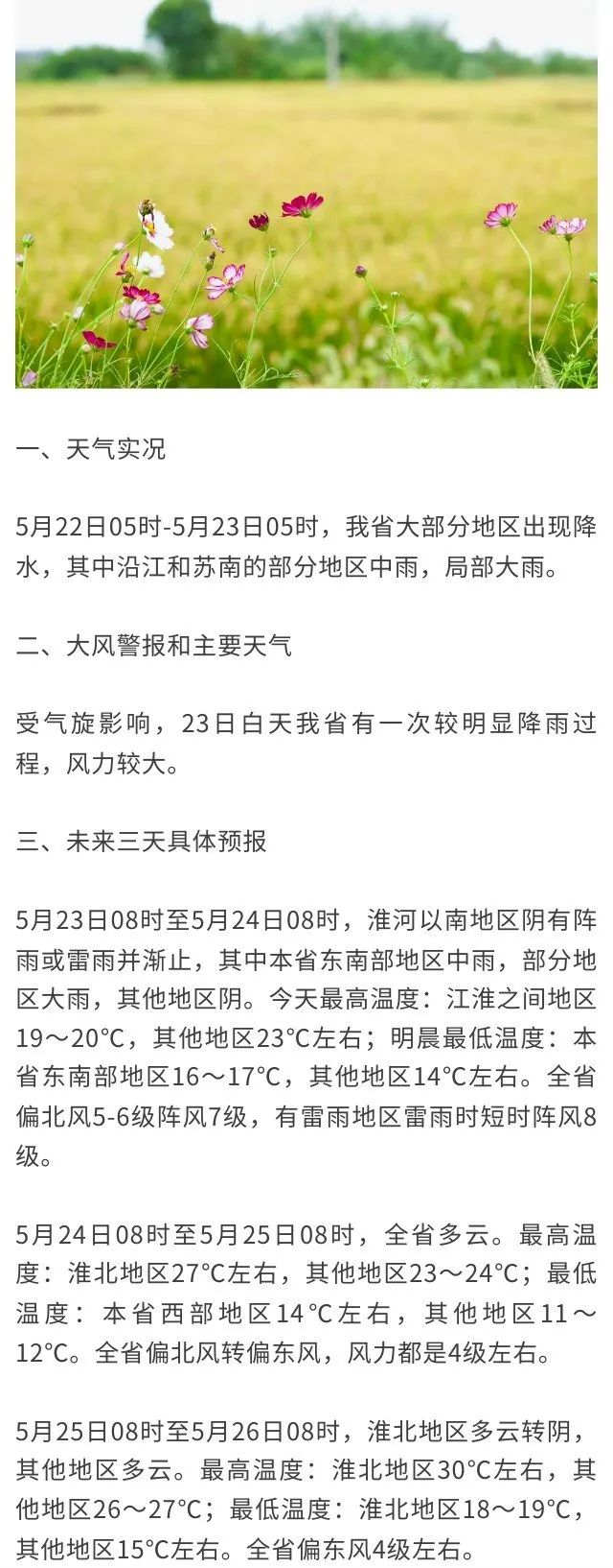【受气旋影响,23日白天我省有一次较明显降雨过程,风力较大】5月23日08时至5月24日08时,淮河以南地区阴有阵雨或雷雨并渐止,其中本省东南部地区中雨,部分地区大雨,其他地区阴。今天最高温度:江淮之间地区19~20℃,其他地区23℃左右;明晨最低温度:本省东南部地区16~17℃,其他地区14℃左右。全省偏北风5-6级阵风7级,有雷雨地区雷雨时短时阵风8级。