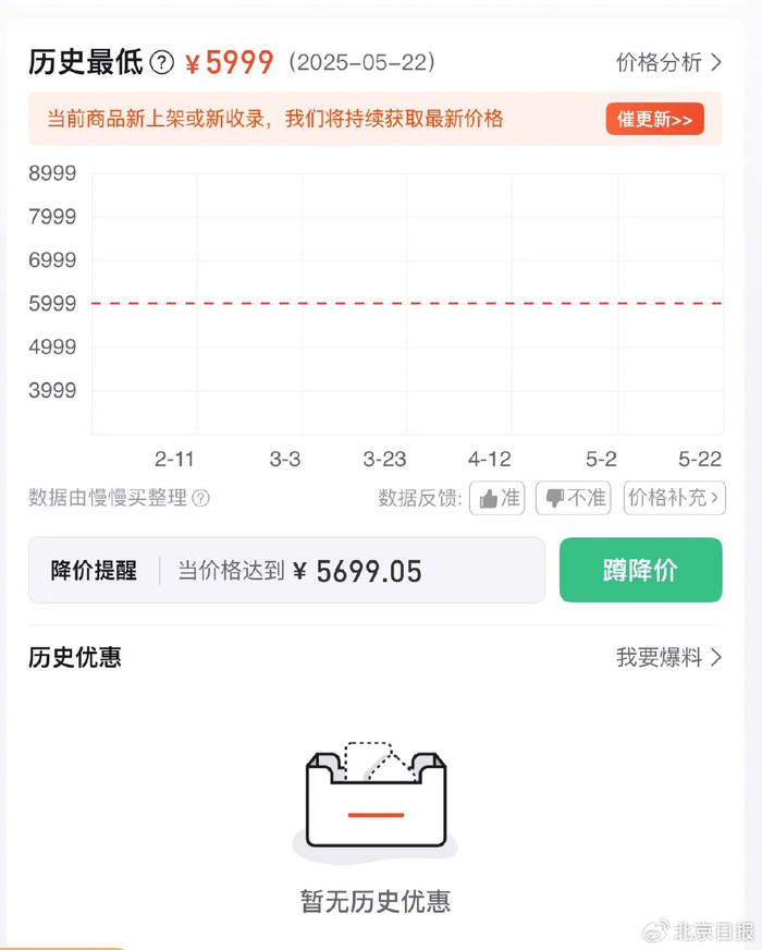 而唯一的这款比价APP,识别出结果之后,显示的也都是商品的原价。可另一端的直播间里,一会儿又是平台券,一会儿又是国家补贴券,减来减去之后,早就不是原先的价格了。记者分两天在同一家售卖学习机的直播间看到,前一天因为有各种补贴的存在,原价5999的学习机降价到了4999元,而第二天因为缺少了一张平台券,产品价格回升到了5499元。但在比价平台,这两天包括之前几个月的产品价格曲线没有丝毫波动,一直都维持在5999的原价上。下方的“历史优惠”一栏,也没有任何显示。