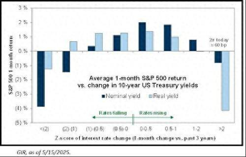 高盛此前发布的一份研究显示,从历史上看,关键变量是美债收益率上涨的速度而不是绝对水平。 当10年期美债收益率在1个月内出现约2个标准差的涨幅时,股市往往会出现反应。